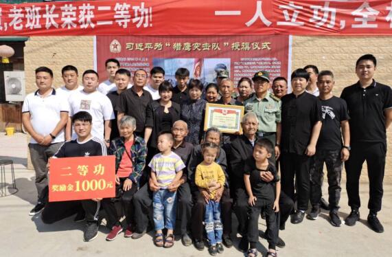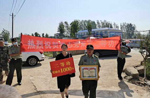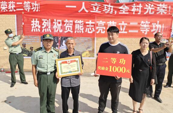 (李新建 劉建國)9月18日,在這個特殊的日子,河南駐馬店正陽縣慎水鄉(xiāng)王牌村熱鬧非凡、鑼鼓喧天,鞭炮齊鳴,中國人民武裝警察部隊獵鷹突擊隊特戰(zhàn)訓(xùn)練大隊對抗中隊中隊長熊志亮家迎來了二等功軍章。在正陽縣人民武部政委胡春雷的帶領(lǐng)下,縣軍人事務(wù)局領(lǐng)導(dǎo)和武警官兵一起,高舉“祝賀熊志亮同志榮立二等功”橫幅、二等軍功章牌匾和千元慰問金送到家屬手中。
