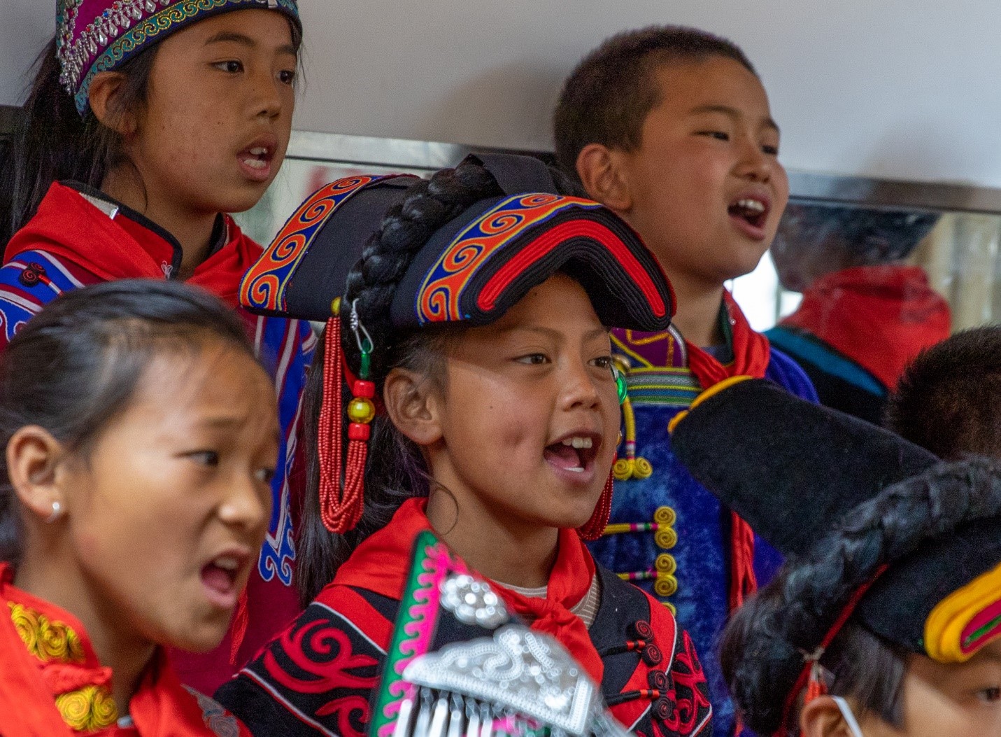 楊花校長是云寶舞蹈隊項目總負(fù)責(zé)人,云寶舞蹈隊可以說是在她的帶領(lǐng)下一路成長起來,她也有自己的藝術(shù)堅持:對于《彝紅》不斷進(jìn)行創(chuàng)新、優(yōu)化,精益求精??梢钥隙ǖ氖?,他們對于彝族文化的傳承和堅持永遠(yuǎn)不會變。離開操場,耳聞清亮的歌聲,循聲前行,原來是象寶合唱團(tuán)正在訓(xùn)練中?;顒咏淌依?,隊員們跟著指導(dǎo)教師期沙高忠老師的指揮,用心練習(xí)彝族歌曲《索瑪花開》和《天空之城》,孩子們唱得既投入又享受。
