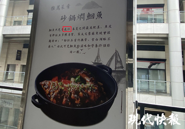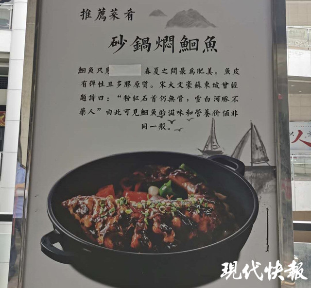 在秦淮區(qū)一家餐飲店,門口兩側矗立了多塊巨幅菜品廣告牌。雖然店家將廣告牌中出現的“江鮮”改成了“魚鮮”。但有的菜品宣傳文字仍有“長江”等字樣。比如,該餐飲店的一道推薦菜品“砂鍋燜鮰魚”,在廣告牌的推薦語中就這樣寫道:鮰魚只見于長江,春夏之間最為肥美……雖然未直接點名江鮮,但“鮰魚只見于長江”的說法,不免讓人產生聯想。對此,店家表示,這道菜原材料鮰魚為人工養(yǎng)殖,并未野生捕撈。