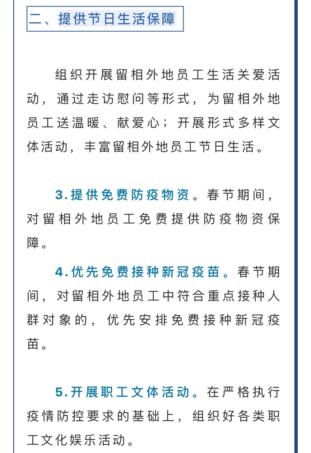 《措施》提出,將組織開(kāi)展留相外地員工生活關(guān)愛(ài)活動(dòng),通過(guò)走訪慰問(wèn)等形式,為留相外地員工送溫暖、獻(xiàn)愛(ài)心;開(kāi)展形式多樣文體活動(dòng),豐富留相外地員工節(jié)日生活。