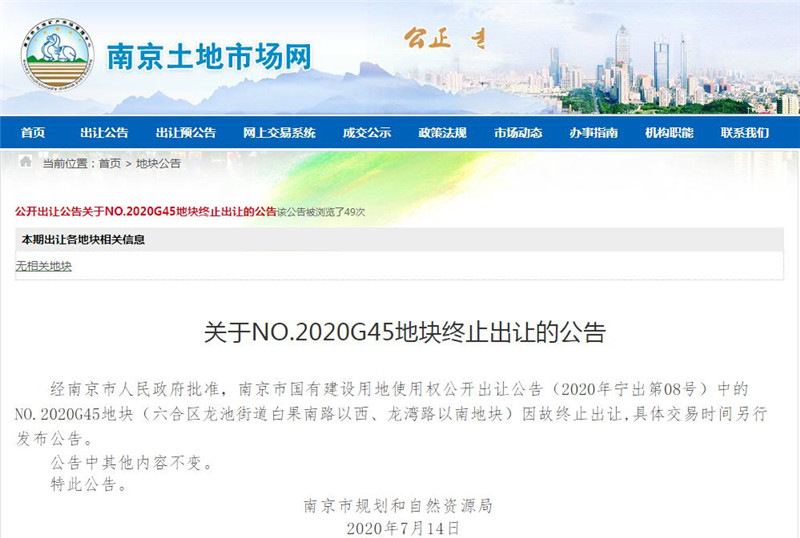早在6月12日,南京掛出10幅涉宅地塊,要求按照“限房價、競地價”的方式出讓。7月14日,南京市規(guī)劃和自然資源局發(fā)布公告稱,經(jīng)南京市人民政府批準(zhǔn),南京市國有建設(shè)用地使用權(quán)公開出讓公告(2020年寧出第08號)中的NO.2020G45地塊(六合區(qū)龍池街道白果南路以西、龍灣路以南地塊)因故終止出讓,具體交易時間另行發(fā)布公告。