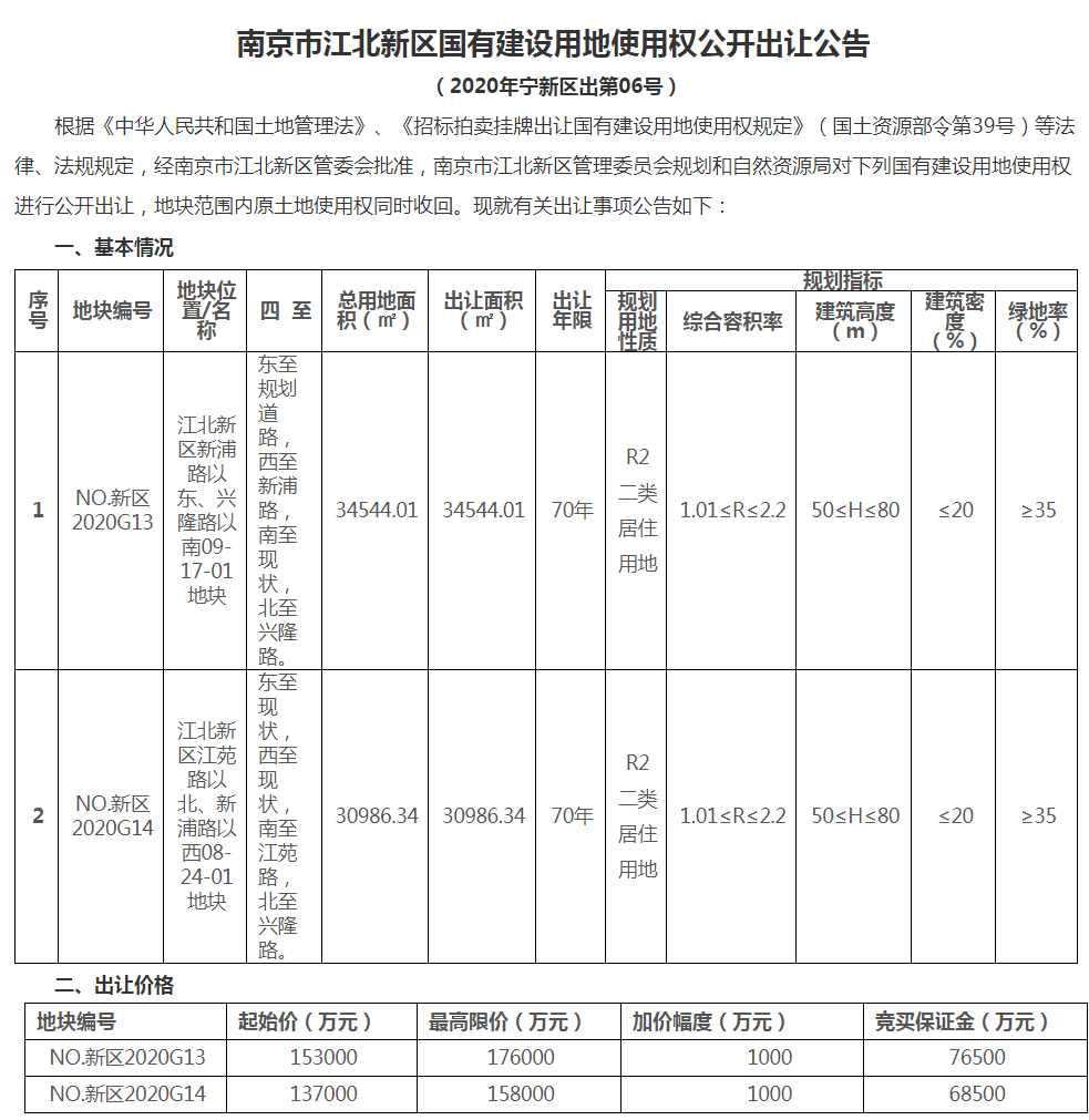 8月26日,南京市江北新區(qū)國有建設(shè)用地使用權(quán)公開出讓公告(2020年寧新區(qū)出第06號)發(fā)布,江北新區(qū)核心區(qū)兩幅住宅用地亮相。新區(qū)G13是江北新區(qū)新浦路以東、興隆路以南09-17-01地塊,另一幅新區(qū)G14是江北新區(qū)江苑路以北、新浦路以西08-24-01地塊,兩幅地塊相鄰,僅隔一條新浦路,出讓面積也都是3萬多㎡,二類居住用地。