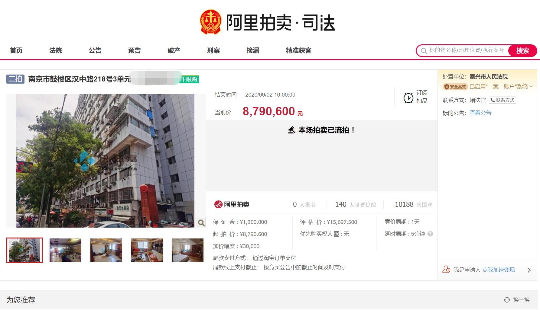 此前,在8月11日,泰興市人民法院對(duì)該房產(chǎn)進(jìn)行了第一次司法拍賣(mài),當(dāng)時(shí)的起拍價(jià)為1098萬(wàn),單價(jià)為54163元/㎡,不過(guò)一直無(wú)人報(bào)名,最終流拍。9月1日,這套房產(chǎn)進(jìn)行了第二次拍賣(mài),這次拍賣(mài)價(jià)格比市場(chǎng)評(píng)估價(jià)降了690余萬(wàn),以879.06萬(wàn)底價(jià)起拍,單價(jià)僅為43331元/㎡,相當(dāng)于市價(jià)的5.5折左右。參與競(jìng)拍的人需要繳納保證金120萬(wàn)元,加價(jià)幅度為3萬(wàn)。