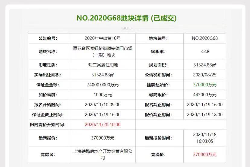 安德門鐵路貨運市場地塊位于南京市雨花臺區(qū)賽虹橋街道鳳臺南路以東,寧蕪鐵路線以西。為切實貫徹落實《國務院辦公廳關于支持鐵路建設實施土地綜合開發(fā)的意見》和《省政府辦公廳關于支持鐵路建設推進土地綜合開發(fā)的實施意見》,支持鐵路投融資體制改革,盤活鐵路既有存量建設用地,提升城市形象,江蘇省自然資源廳所有者權益處指導南京市規(guī)劃和自然資源局和中國鐵路上海局集團有限公司,結合城市規(guī)劃和鐵路運輸組織方式調整,按照“整體規(guī)劃、統(tǒng)一收儲、分塊供地、分期開發(fā)”的原則,對該地塊進行綜合規(guī)劃利用引導。在該地塊所屬片區(qū)控制性詳細規(guī)劃獲南京市政府批復,并完成地塊范圍內建材市場等清退關閉和環(huán)境整治、高壓架空電線遷改落地、環(huán)評、文物勘探等前期凈地收儲整理工作后,啟動出讓程序。最終地塊由中國鐵路上海局集團有限公司下屬的上海鐵路房地產開發(fā)經營有限公司競得。