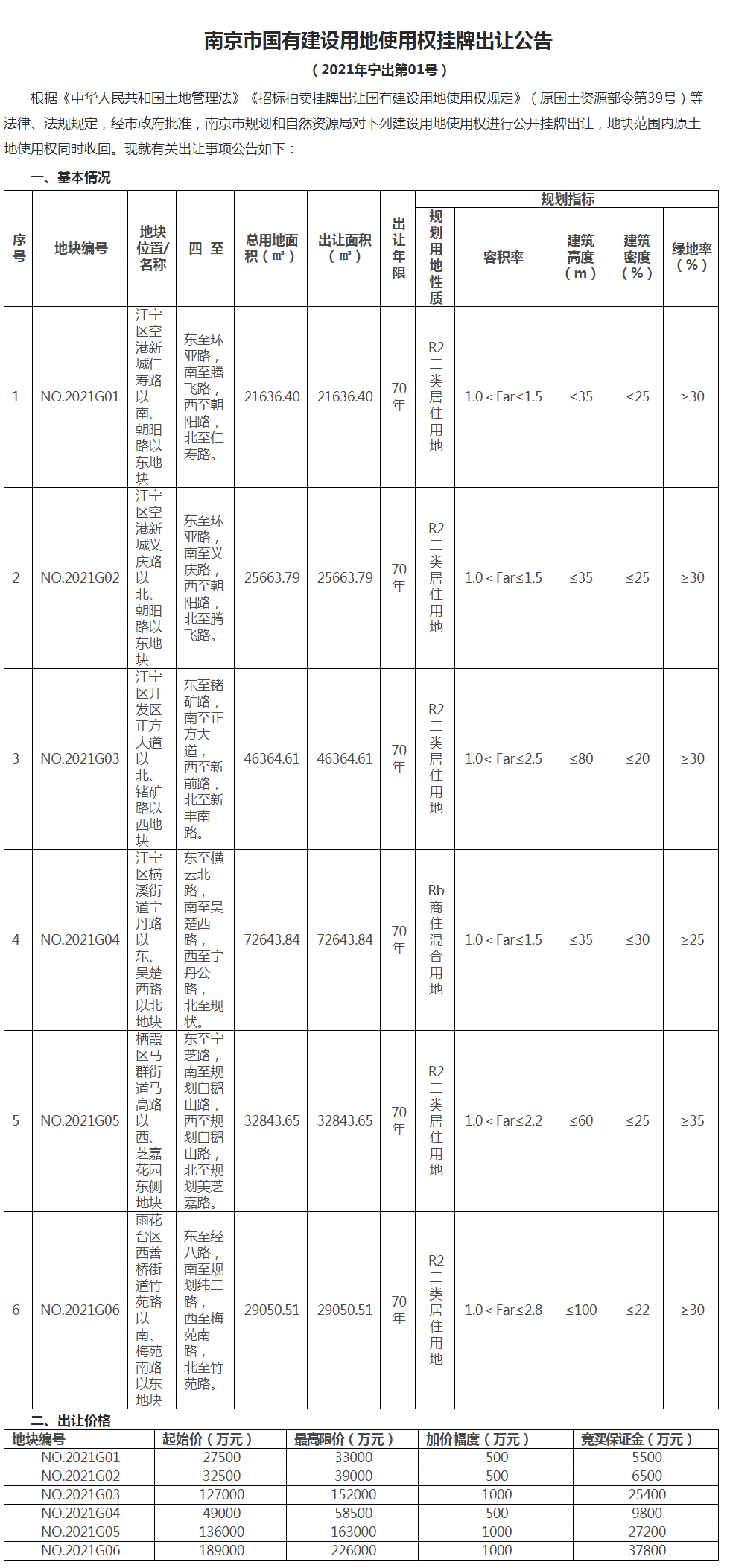 (記者 張瑜)1月21日,南京土地市場網(wǎng)發(fā)布南京市國有建設(shè)用地使用權(quán)掛牌出讓公告(2021年寧出第01號),掛出6幅地塊,均為涉宅用地,起拍總價56.1億元,總用地面積達22.82公頃?,F(xiàn)代快報記者看到,這批地塊涉及城南兩橋、南部新城及紫東、江寧等多個片區(qū),位于西善橋的1幅純宅地毛坯房限價3.8萬/㎡,備受關(guān)注。據(jù)悉,該批地塊將于2021年2月24日上午10:00開始網(wǎng)上競拍。