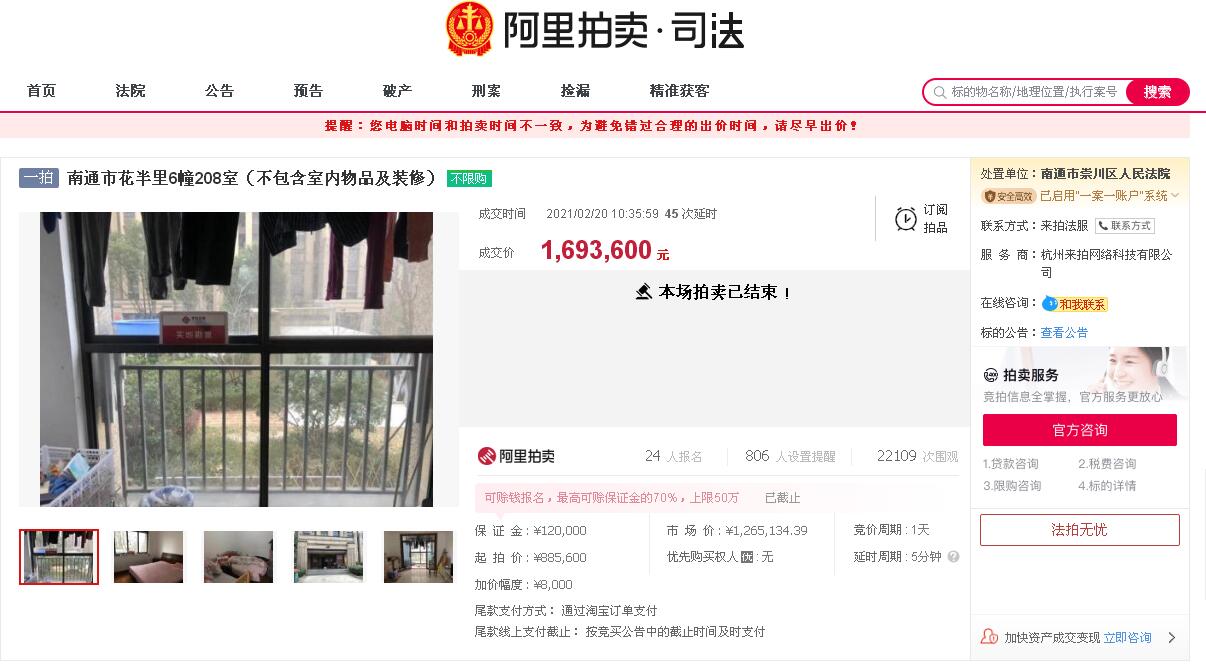2021年2月19日,這套房產(chǎn)上架進行司法拍賣。據(jù)阿里拍賣平臺,這套位于南通市花半里的房產(chǎn)建筑總面積為88.25㎡,房產(chǎn)評估價為126萬余元。此次司法拍賣的起拍價定為88.56萬元,參與競買者需要繳納保證金12萬元。