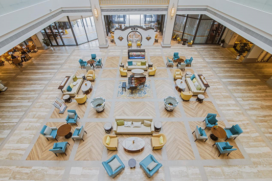 吳園在建筑風(fēng)格上融入了蘇州特有的園林式景觀設(shè)計,隨處可見的白墻青瓦、茶園迷宮、假山疊瀑、風(fēng)雨連廊。會所的活動區(qū)明媚淡雅,美勒森團隊在產(chǎn)品的風(fēng)格設(shè)計上也圍繞泰康吳園的空間主基調(diào),將傳統(tǒng)的蘇式韻味融入到產(chǎn)品的每個細(xì)節(jié); 在產(chǎn)品上采用不同形式的沙發(fā)組合和休閑桌椅組合,為寬敞明快的大堂增添了更多的變化和功能。