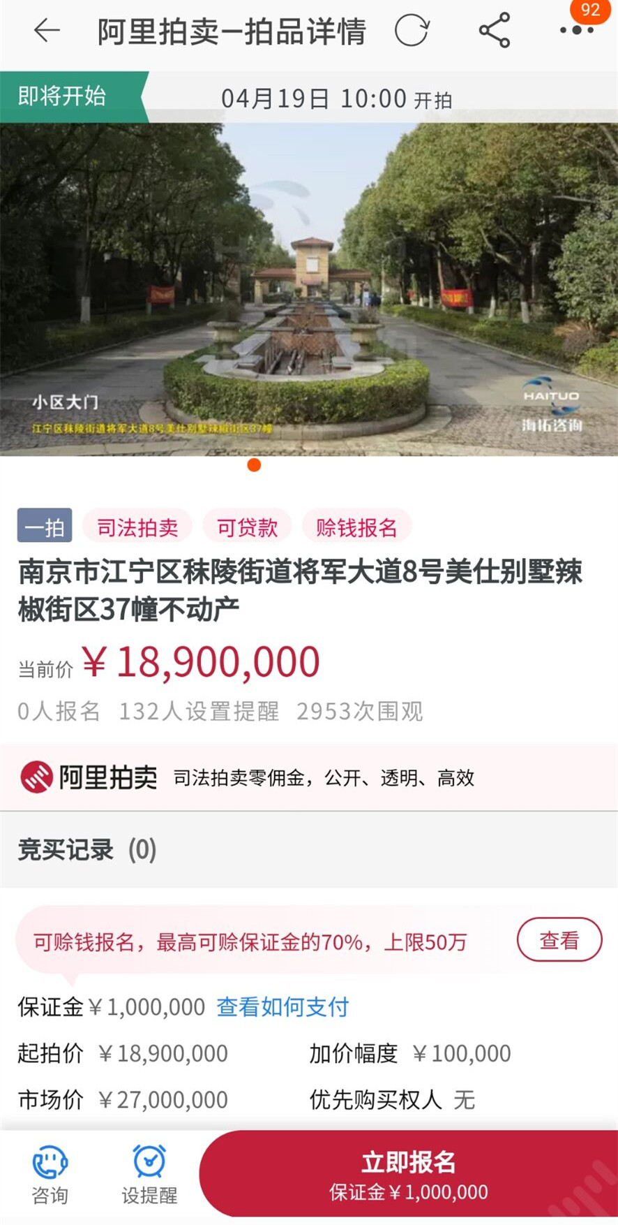 據(jù)了解,南京市秦淮區(qū)人民法院將于2021年4月19日上午10點(diǎn)到2021年4月20日上午10點(diǎn)在阿里拍賣平臺(tái)進(jìn)行公開拍賣,起拍價(jià)為1890萬元,保證金為100萬元,加價(jià)幅度為10萬元。