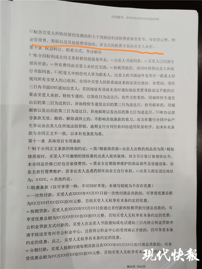 業(yè)主戴先生就和陸先生存在同樣的情況。戴先生的購(gòu)房合同簽訂于2018年2月。合同補(bǔ)充協(xié)議約定,房子不含稅價(jià)款為1901359元,稅率11%。但是2019年12月開(kāi)具的發(fā)票則顯示,房屋不含稅價(jià)提高為1930195.41元,稅率為9%。發(fā)票上不含稅房屋價(jià)款高出2.8萬(wàn)多元。實(shí)際上,戴先生房子的交付面積也是比合同上約定的小。