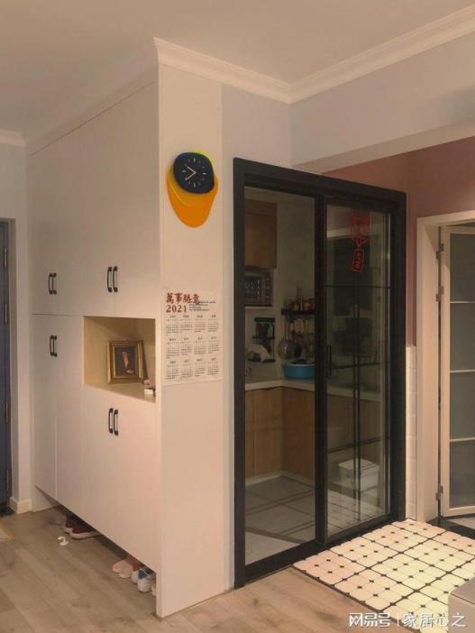 把廚房空間縮小了一下,設(shè)計成一面墻的玄關(guān)柜,美觀實用,進門收納方便輕松,柜子是很簡單的黑白配風(fēng)格,多隔斷滿足各種收納需求,最下面鏤空區(qū)域放置鞋子,柜子側(cè)面雖然不大,但選擇了一個大小剛剛好的時鐘,既美觀實用又能點綴生活。