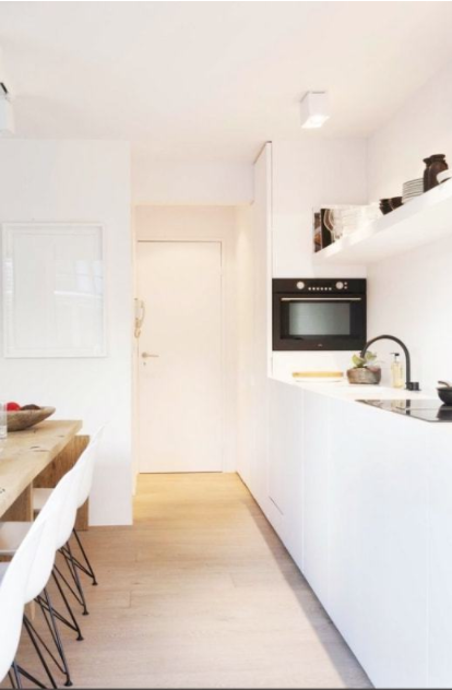 別急著反駁,先看看這種靠墻做高柜,代替原本吊柜的做法,有啥好處,再來評(píng)價(jià)哪種模式更適合你的小廚房: