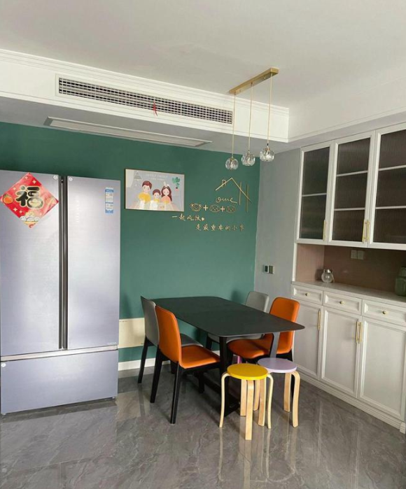 餐廳背景墻選擇了深綠色的設(shè)計(jì),為整個(gè)家居環(huán)境增添一抹綠色,青春有活力,視覺上也會(huì)起到放松的體驗(yàn),黑色巖板餐桌,搭配各種顏色的餐椅和餐凳,打造多姿多彩的生活氛圍。餐邊柜嵌入式設(shè)計(jì),擁有多種收納空間,長虹玻璃柜門作為酒柜剛剛好,若隱若現(xiàn)的效果,給人一種好奇感和神秘感。