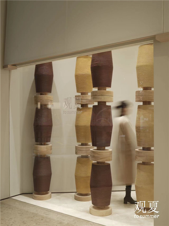 觀夏云坊的空間設(shè)計靈感來源于匠人創(chuàng)作云錦的過程,用空間之美講述一絲一線編織而成的故事。云錦織布機體型高大,需要一對云錦匠人同時親密合作才能運轉(zhuǎn),織布機上的絲線和織物要經(jīng)過很多雙手的反復(fù)觸摸,最終才能成為一件在古代只有皇室才能使用的藝術(shù)品。觀夏云坊外立面裝飾的木棍和棉線,意在模擬織布機的結(jié)構(gòu)。云錦織布機的構(gòu)造很特殊,工匠們在編織時只能看到云錦背面的經(jīng)緯走勢,也就是“織造”的過程。