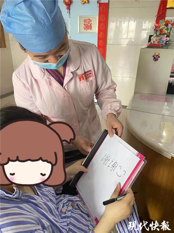 用眼神和紙筆進(jìn)行特殊又溫暖的“對話”,給了胡女士很大的信心,順利誕下一名女寶寶。“分娩完非常激動,她自己不會寫字,為了表達(dá)自己的謝意,所以她就照著手機(jī)寫了謝謝兩個(gè)字來感謝我們,還畫了一個(gè)笑臉,這個(gè)新年禮物讓我倍感溫暖,雖然是無聲的,但也讓我有了滿滿的職業(yè)自豪。”邵丹丹說。