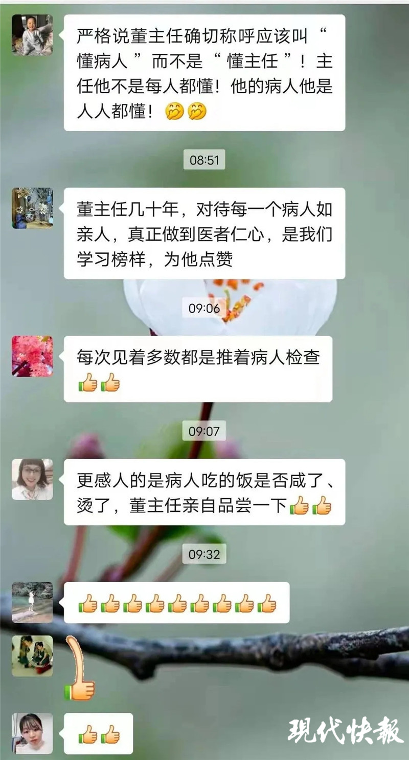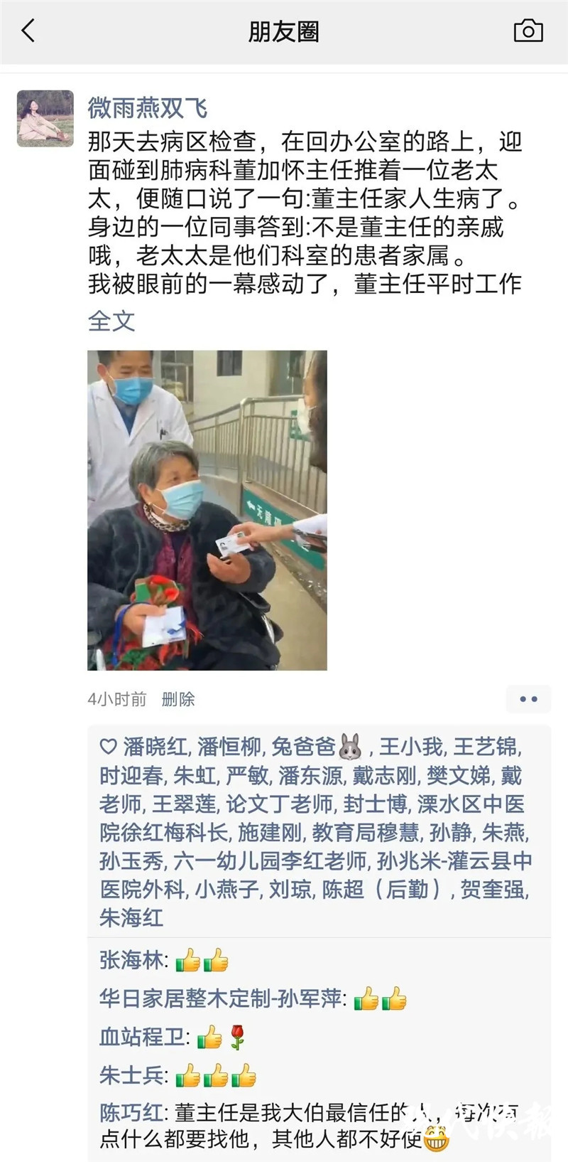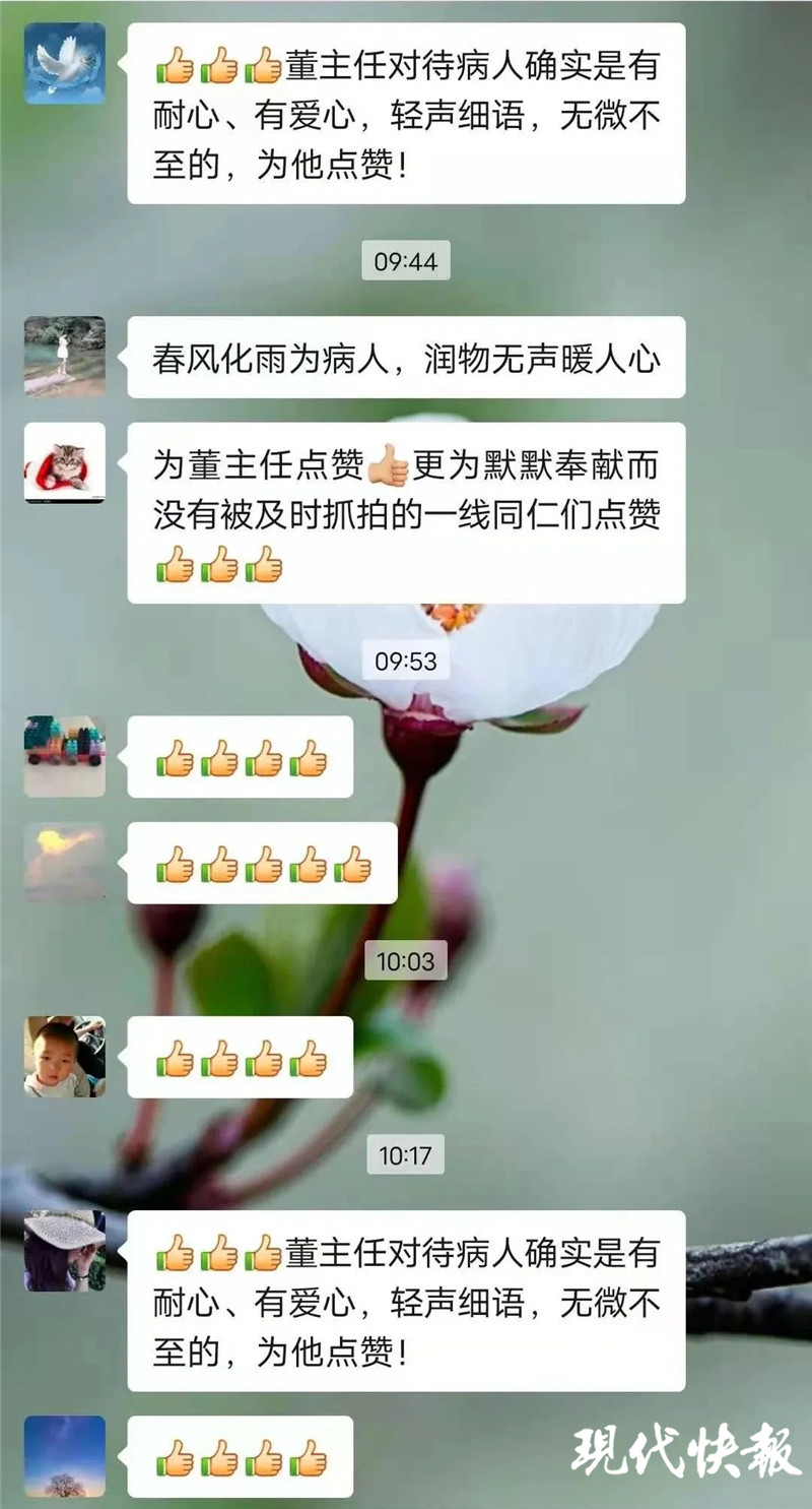 為了表揚(yáng)董加懷暖心照顧患者家屬的行為,陳美榮將董加懷推著老人的圖片配上一段感想,發(fā)到朋友圈和醫(yī)院的群里,結(jié)果引起全院醫(yī)護(hù)人員的一致點(diǎn)贊,“春風(fēng)化雨為病人,潤(rùn)物無聲暖人心”“董主任總是把辛苦留給自己,把愛和健康帶給病人”……