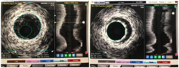 今年70歲的李大爺(化名)因“反復(fù)胸悶不適半年”入院,半年前曾行冠狀動(dòng)脈造影,未達(dá)到處理指征,術(shù)后規(guī)范用藥治療。但患者平日仍感覺胸悶不適,入院后醫(yī)生精準(zhǔn)評估血管病變情況,建議行血管內(nèi)超聲檢查指導(dǎo)下一步手術(shù)方案。經(jīng)過反復(fù)對比分析,IVUS測得患者右冠遠(yuǎn)端高度狹窄,最狹窄處約80%,達(dá)到了干預(yù)標(biāo)準(zhǔn)。征得患者及家屬同意后,對右冠病變處成功置入支架一枚,患者反復(fù)胸悶癥狀也得以解決。