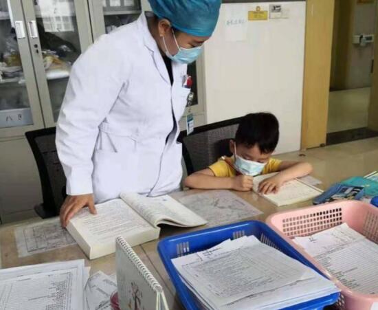 “每天都在小小的值班室,兒子有時候會鬧情緒,今天上午都哭了兩次了,說一個人孤獨(dú)害怕。”王珂瑋雖然很心疼,但還是把更多的時間和精力放在病人身上,只有在吃飯的時候才擠出時間陪兒子玩。為了讓兒子能夠安靜地待在值班室里,王珂瑋也買了語文和數(shù)學(xué)練習(xí)冊給兒子做,空閑的時候也會親自輔導(dǎo)孩子。