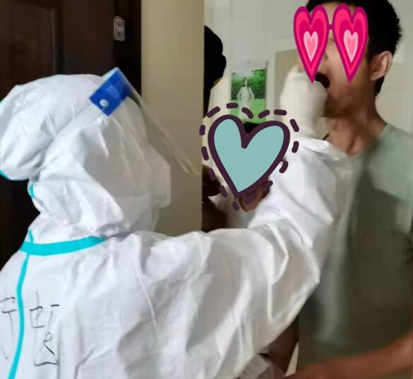 下午的任務(wù)更加艱巨,需要上門(mén)進(jìn)行核酸采集,大家快速解決午飯、補(bǔ)充水分后就開(kāi)始行動(dòng)了。根據(jù)分配的名單信息,王維在志愿者的幫助下挨家挨戶(hù)地上門(mén)確認(rèn),她所負(fù)責(zé)的區(qū)域是一棟六層樓的老小區(qū),共四個(gè)單元,沒(méi)有電梯,需要一層一層地爬上去,再爬下來(lái),再上去,如此周而復(fù)始。六層樓不斷來(lái)回爬本就是極其消耗體力的,再加上當(dāng)天悶熱的天氣、密不透風(fēng)的防護(hù)服讓她的體力基本處于透支狀態(tài),濕透的褲子裹住雙腿,邁開(kāi)的步伐越來(lái)越沉重,終于爬上六樓時(shí),她感覺(jué)腦袋都要炸開(kāi)了,開(kāi)始耳鳴聽(tīng)不清別人說(shuō)的話(huà),她靠在欄桿上,感覺(jué)自己的雙腿不停地發(fā)抖,她艱難地告訴志愿者讓家里的老奶奶稍等一下,她要歇一歇。此時(shí)屋內(nèi)等候采集的老奶奶也察覺(jué)出王維的不適了,要讓她進(jìn)屋休息一下,可此時(shí)身穿防護(hù)服的王維知道這是絕對(duì)不行的,在疫情面前不能絲毫懈怠,她搖了搖頭,老人家就貼心地將家里的電風(fēng)扇轉(zhuǎn)了個(gè)方向,對(duì)著王維吹,看著老奶奶忙前忙后,雖然電風(fēng)扇的風(fēng)吹不進(jìn)她的防護(hù)服,卻吹進(jìn)了她的心里,讓疲憊不堪的王維突然感到了一絲涼意。休息過(guò)后王維的體力稍有了恢復(fù),頭疼也有了緩解,于是她完成了老奶奶的核酸采集。