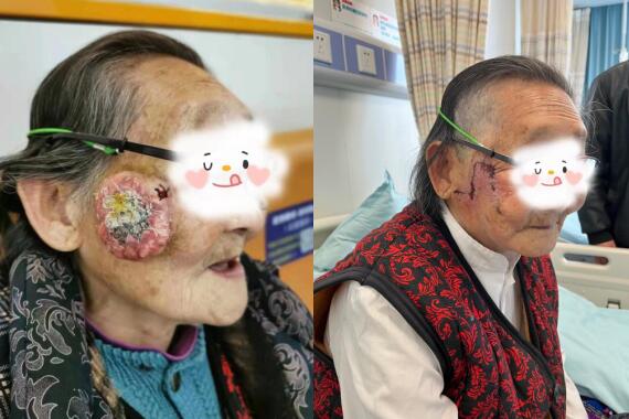 王奶奶今年101歲,平時身體健康,生活能自理。但在3個月前她的右臉長了一個蠶豆大小的‘痘痘’。“我們當時還跟奶奶開玩笑說,您這是青春未老,青春痘都有了。”王奶奶的孫子夏先生提到患病情況時仍然心有余悸。“另外,老人臉上長斑、長痘我們也覺得正常,畢竟年紀這么大了。”但一個半月過去了,家人們口中的“青春痘”并沒有消褪,反而越長越大。“眼看著就從蠶豆變成了饅頭大小,我們覺得這不正常,還是得到醫(yī)院看一下。”
