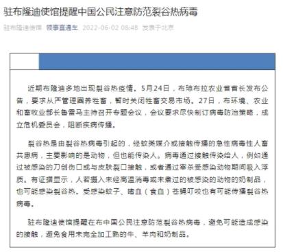 中國(guó)駐布隆迪使館提醒在布中國(guó)公民注意防范裂谷熱病毒,避免可能造成感染的接觸,避免食用未完全加工熟的牛、羊肉和奶制品。