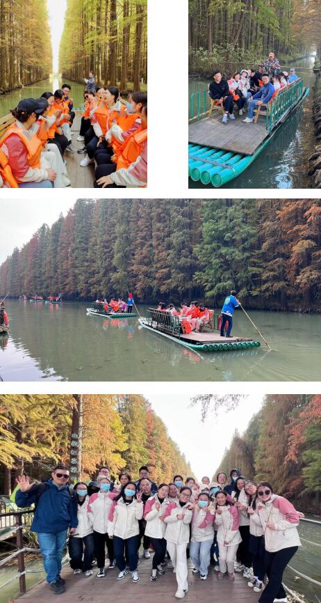 接著大家來到了金湖水上森林景區(qū),這里素有“池杉王國、鳥類天堂、天然氧吧”的美譽,大家觀賞著水潺池杉林,鴨游蘆葦間,漫步林中小道,腳踏松軟杉葉,耳伴鳥鳴蟲吡,靜聞草木芬芳,到處都是絕佳的拍照勝地,為整場活動添色增彩;在竹筏漂流環(huán)節(jié),大家在水上欣賞紅黃綠三色衫樹森林和“一線天”、“迎客杉”“萬佛朝宗” 等景觀,坐在士制竹筏上順水漂流,仿佛置身于山水之間,流連于田園風光,使人忘記了都市的喧囂和煩雜。