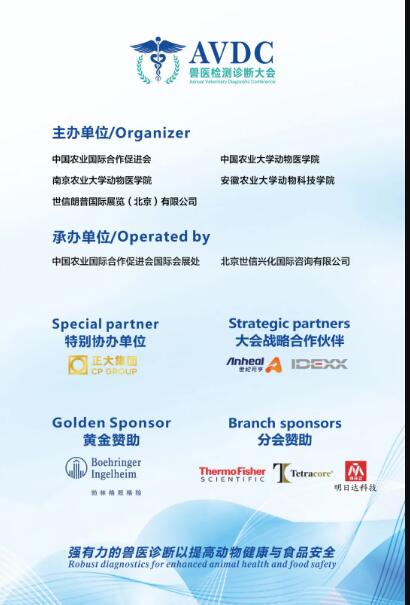 本次大會由中國農(nóng)業(yè)國際合作促進(jìn)會、中國農(nóng)業(yè)大學(xué)動物醫(yī)學(xué)院、南京農(nóng)業(yè)大學(xué)動物醫(yī)學(xué)院、安徽農(nóng)業(yè)大學(xué)動物科技學(xué)院、世信朗普國際展覽(北京)有限公司主辦;由中國農(nóng)業(yè)國際合作促進(jìn)會國際會展處和北京世信興化國際咨詢公司承辦;正大集團(tuán)為特別協(xié)助單位,世紀(jì)元亨和愛德士為戰(zhàn)略合作伙伴單位和贊助,勃林格殷格翰為黃金贊助,賽默飛、泰吉科和明日達(dá)科技為分會贊助。