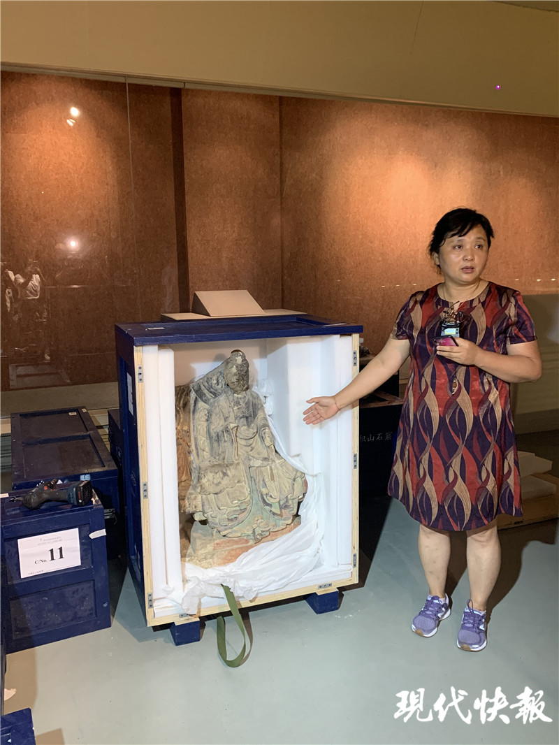 記者發(fā)現(xiàn),展廳里堆滿了大大小小的箱子,李威介紹,這100多個(gè)箱子是由3輛高9米6的大貨車(chē),從麥積山運(yùn)往常州博物館的。“光是卸貨就用了一天半的時(shí)間,因?yàn)槔锩嬗泻芏辔奈铮覀儽仨毿⌒囊硪?,不能有任何閃失。”