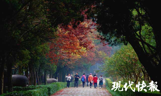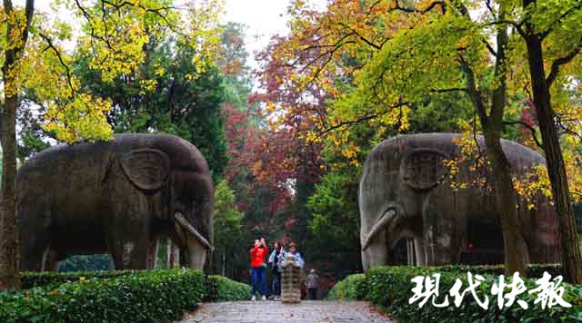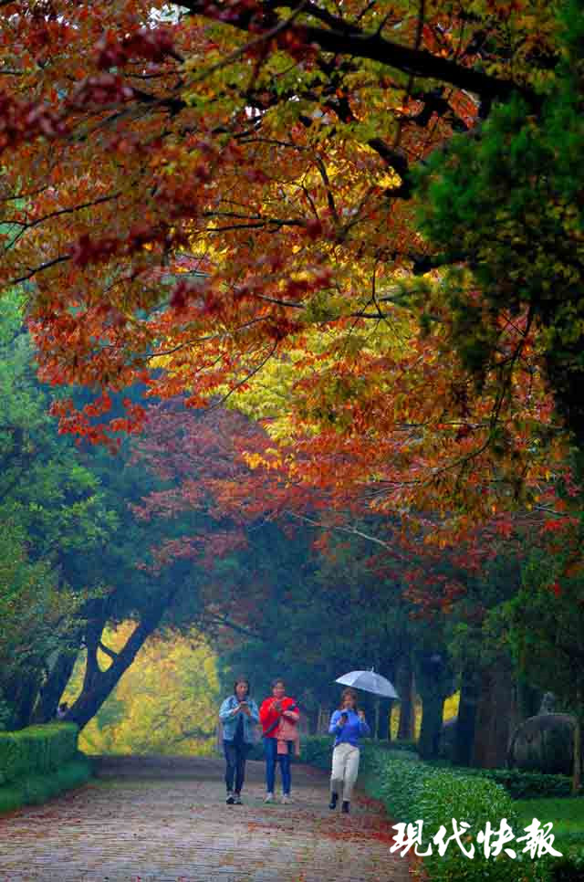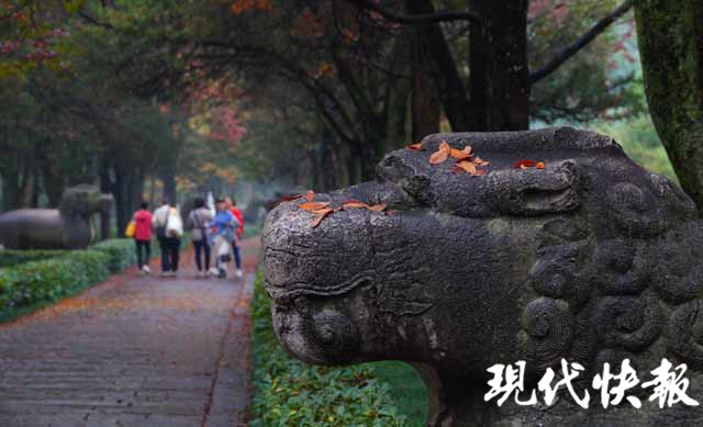 經(jīng)過(guò)秋雨的洗禮,位于明孝陵景區(qū)的石象路色彩更加濃艷,紅、黃、橙、綠數(shù)色相間,美如畫卷。秋雨打過(guò)落葉,飄落在石像之上,那是屬于金陵的古都遺韻。