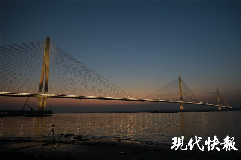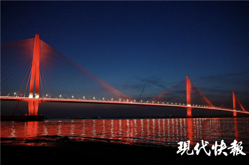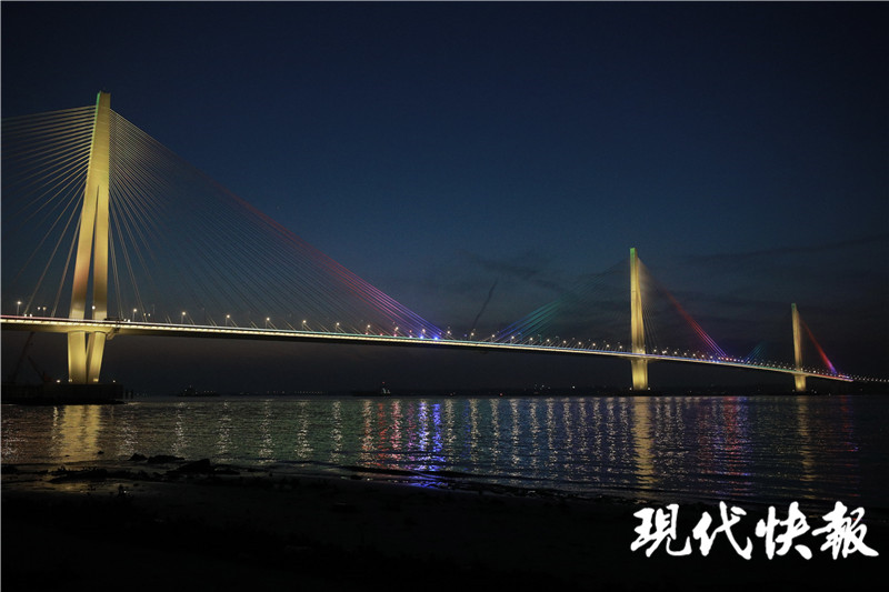 江心洲長(zhǎng)江大橋的燈光準(zhǔn)點(diǎn)亮起,進(jìn)行亮燈調(diào)試,流光溢彩的索塔與橋面交相輝映,如彩色的長(zhǎng)龍橫臥江面,與城市夜景融為一體,曼妙無(wú)比。