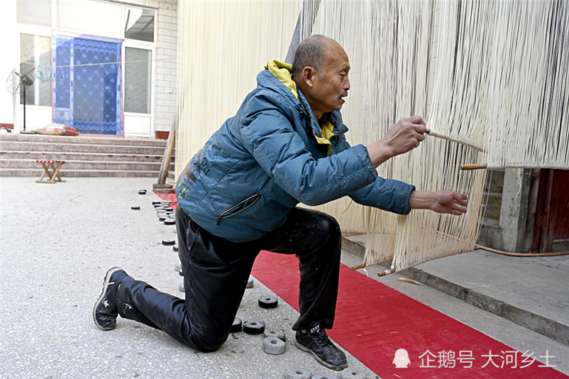 圖為陳世民跪在地上將掛面拉展 圖源:大河鄉(xiāng)土企鵝號(hào)