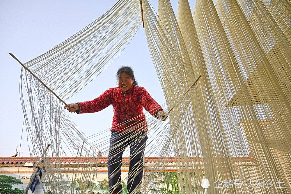 圖為夫妻倆相互配合著晾曬掛面 圖源:大河鄉(xiāng)土企鵝號(hào)