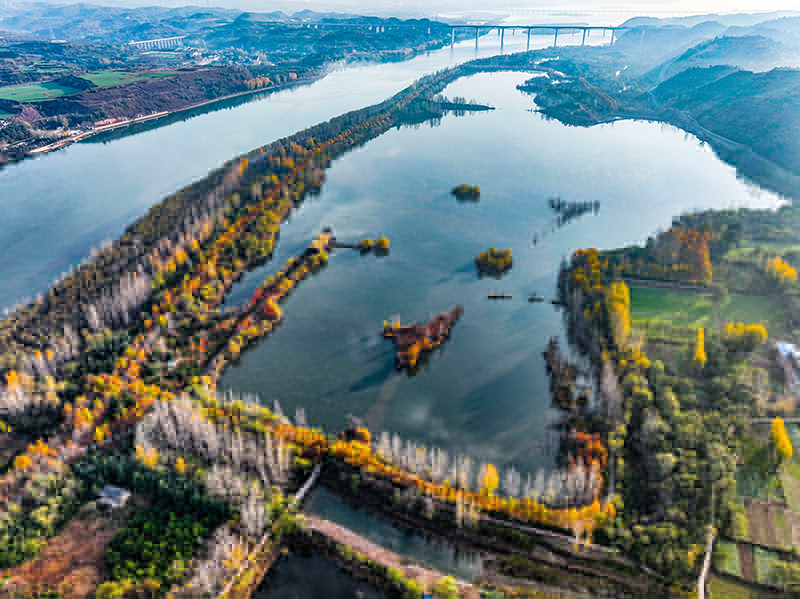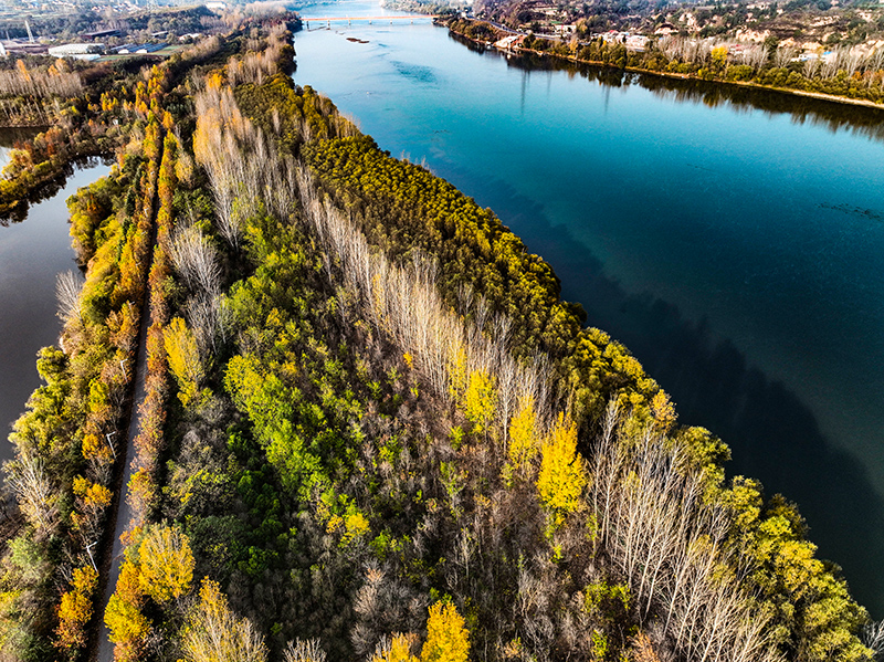 11月14日拍攝的河南黃河濕地國(guó)家級(jí)自然保護(hù)區(qū)濟(jì)源段景色(無(wú)人機(jī)照片)。初冬時(shí)節(jié),河南黃河濕地國(guó)家級(jí)自然保護(hù)區(qū)濟(jì)源段五彩斑斕,美如畫(huà)卷。新華社發(fā)(苗秋鬧 攝)