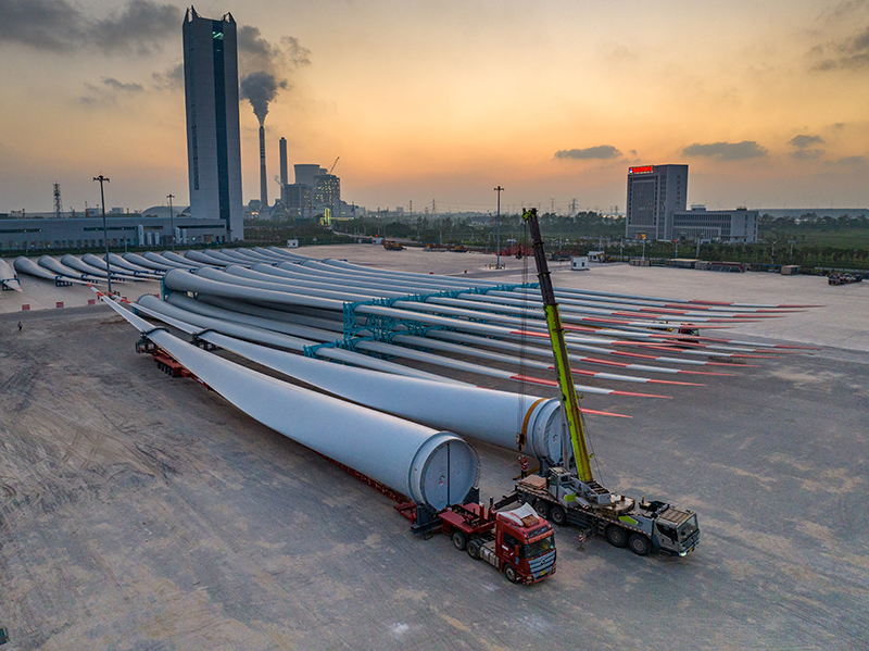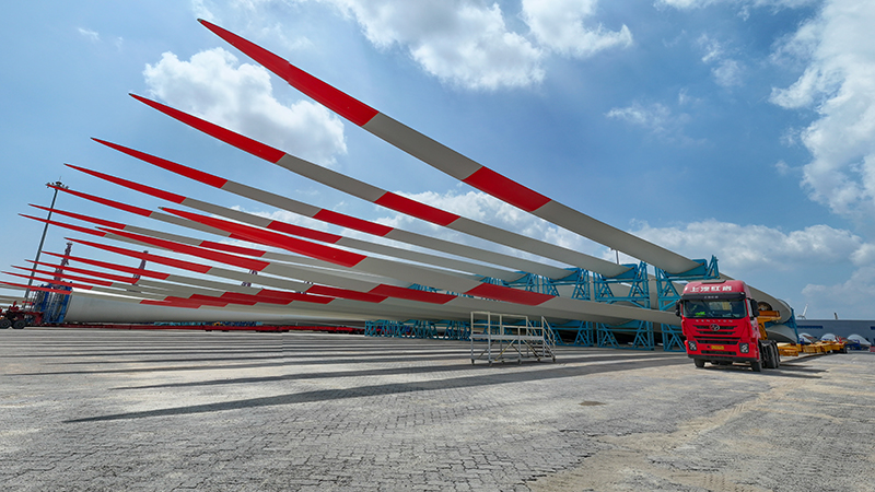 一批風(fēng)電葉片在江蘇鹽城港射陽港區(qū)碼頭等待運(yùn)輸(9月7日攝,無人機(jī)照片)。新華社記者 李博 攝