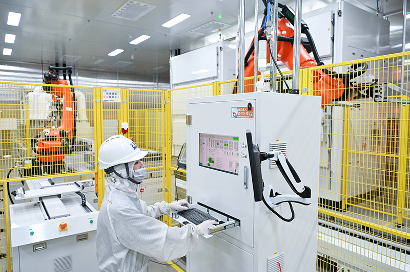工作人員在蜂巢能源科技(鹽城)有限公司生產(chǎn)車間內(nèi)操作智能生產(chǎn)設(shè)備(9月8日攝)。新華社記者 李博 攝