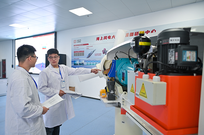 工作人員在江蘇省鹽城市射陽港低(零)碳產(chǎn)業(yè)園中車海上風(fēng)電大功率裝備研發(fā)中心記錄風(fēng)電機(jī)組縮比控制綜合實(shí)驗(yàn)系統(tǒng)數(shù)據(jù)(9月8日攝)。新華社記者 李博 攝