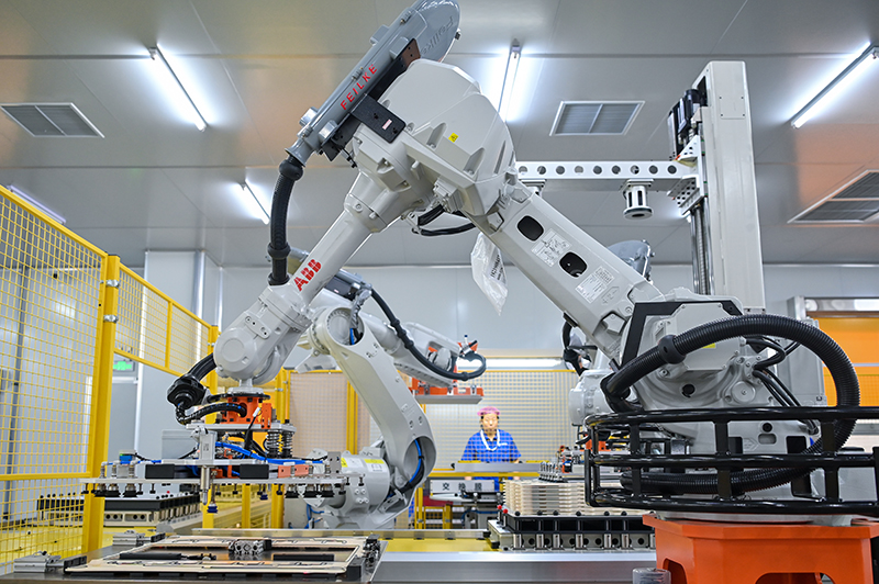 智能機(jī)器人在緯景儲(chǔ)能鹽城智造基地生產(chǎn)車間進(jìn)行鋅鐵液流電池電堆總裝堆疊作業(yè)(9月8日攝)。新華社記者 李博 攝