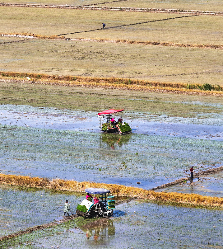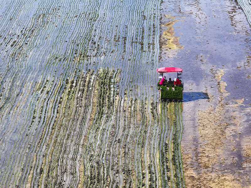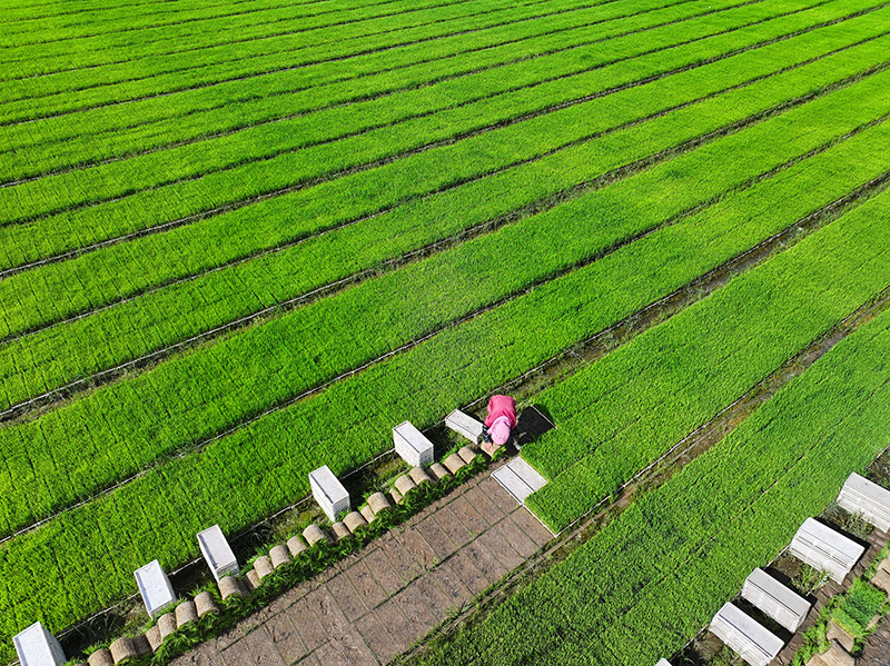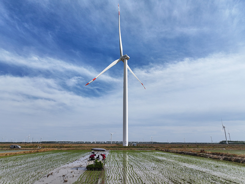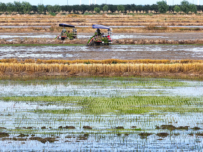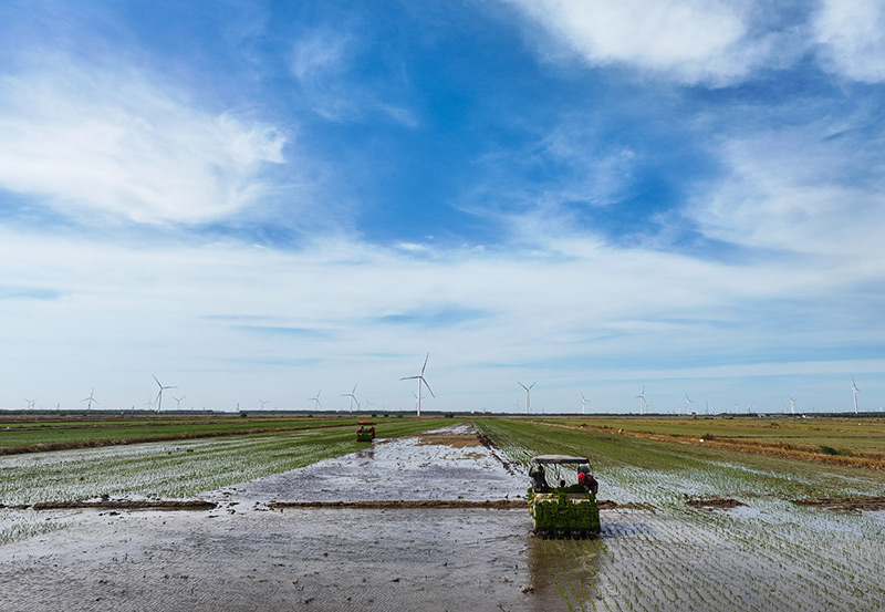 “三夏”時節(jié),位于江蘇省鹽城市射陽縣的江蘇農(nóng)墾臨海農(nóng)場搶抓農(nóng)時,開展機械化插秧作業(yè)。農(nóng)人、農(nóng)機、風(fēng)車在藍(lán)天白云映襯下,構(gòu)成一幅幅美麗的鄉(xiāng)村圖畫。據(jù)了解,今年臨海農(nóng)場水稻種植面積8.4萬余畝,目前插秧作業(yè)已完成過半。