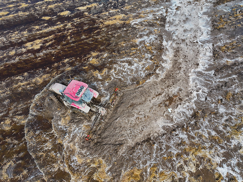 6月18日,農(nóng)業(yè)機械在臨海農(nóng)場一塊水田進(jìn)行起漿作業(yè)(無人機照片)。新華社記者 季春鵬 攝