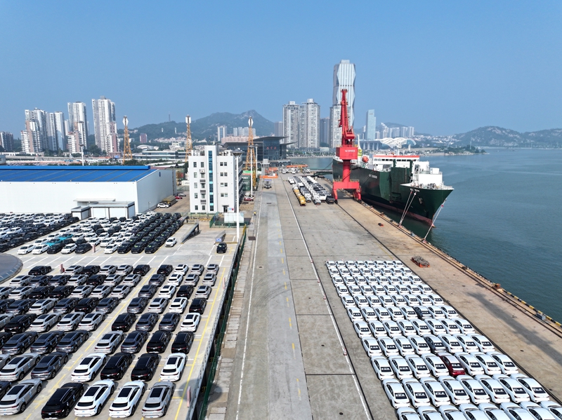 8月24日,在江蘇省連云港港東方港務(wù)分公司碼頭,滾裝輪正在裝載出口車輛(無人機(jī)照片)。新華社發(fā)(王春 攝)