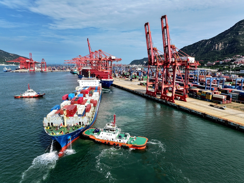 一艘貨輪滿載集裝箱緩緩駛離江蘇省連云港港集裝箱碼頭泊位(8月15日攝,無人機(jī)照片)。新華社發(fā)(王春 攝)