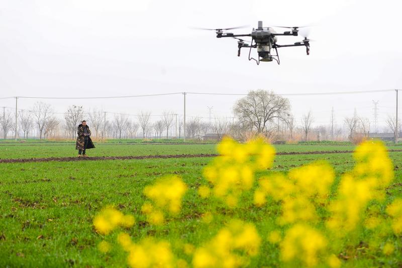 3月5日,在江蘇省興化市陳堡鎮(zhèn)蔡堡村,種植戶使用植保無人機(jī)為小麥?zhǔn)┓省? 當(dāng)日是驚蟄,各地農(nóng)民搶抓農(nóng)時,田間地頭一派忙碌景象。 新華社發(fā)(周社根 攝)