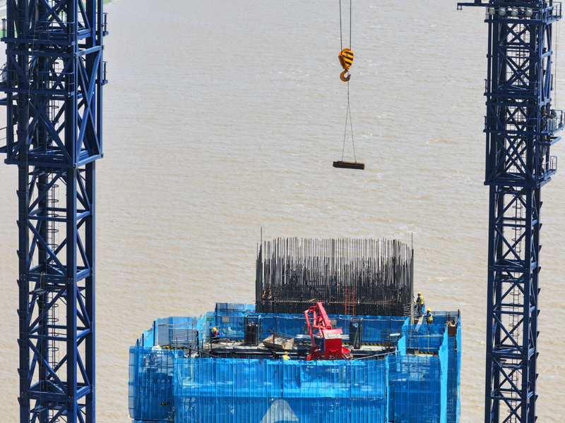 4月13日拍攝的崇啟公鐵長江大橋4號主塔(左)第17節(jié)澆筑施工現(xiàn)場(無人機(jī)照片)。新華社發(fā)(許叢軍?攝)