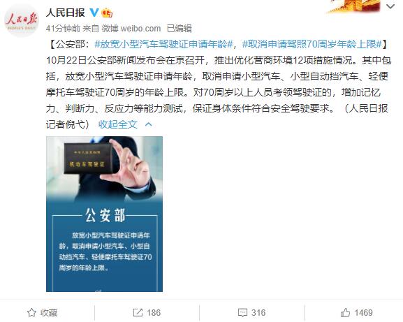據(jù)國(guó)內(nèi)媒體報(bào)道,10月22日公安部新聞發(fā)布會(huì)在京召開,推出優(yōu)化營(yíng)商環(huán)境12項(xiàng)措施情況。其中包括,放寬小型汽車駕駛證申請(qǐng)年齡,取消申請(qǐng)小型汽車、小型自動(dòng)擋汽車、輕便摩托車駕駛證70周歲的年齡上限。