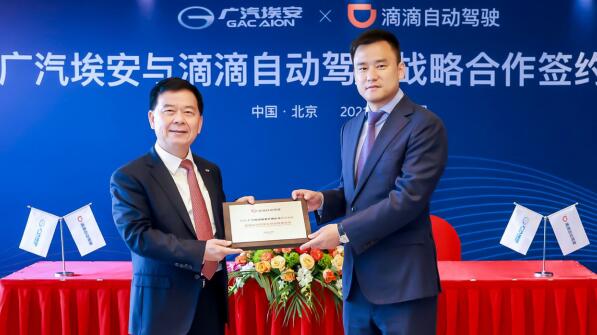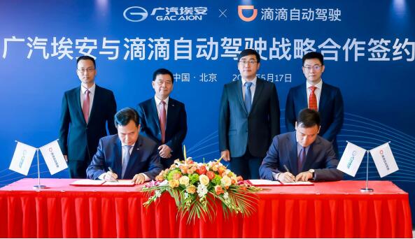 5月17日,滴滴旗下自動駕駛公司宣布與廣汽埃安新能源汽車有限公司達成戰(zhàn)略合作。滴滴出行董事長兼CEO程維與廣汽集團董事長曾慶洪,共同見證簽約儀式。滴滴出行CTO兼自動駕駛CEO張博與廣汽埃安總經(jīng)理古惠南,分別代表滴滴自動駕駛和廣汽埃安簽署協(xié)議。
