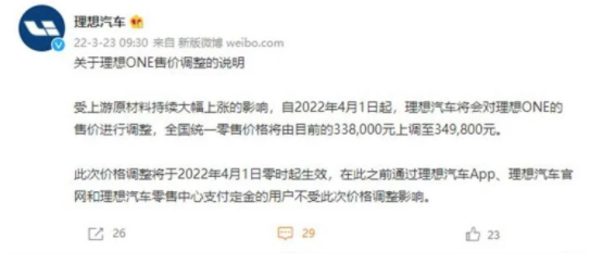 反觀蔚來,作為純電動車型,使用了更大的電池包,也僅僅只是漲價了1萬元,而且在4月10日宣布,5月10日才正式漲價,給消費者預留了足夠久的緩沖時間。
