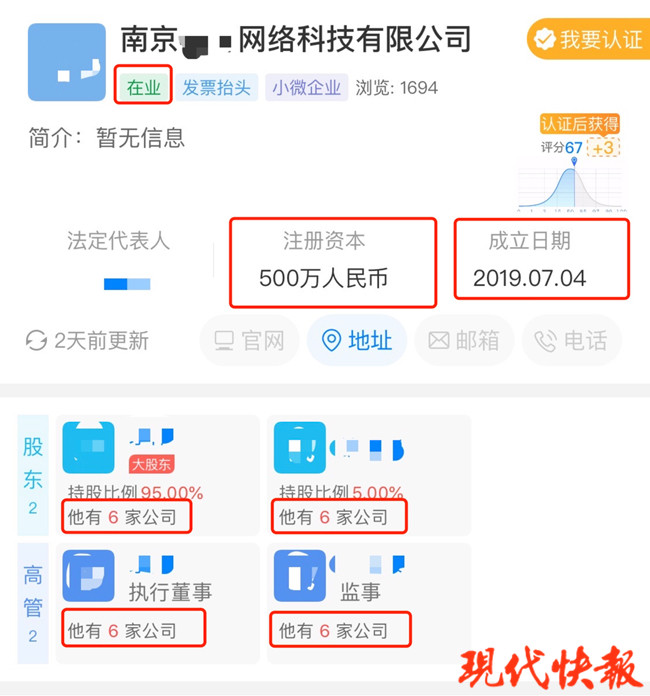 現(xiàn)代快報記者通過天眼查輸入這些涉事學生姓名發(fā)現(xiàn),這些被注冊的公司大多為網(wǎng)絡科技、人力資源、物流運輸?shù)刃∥⑵髽I(yè)。注冊資本皆為500萬元。注冊時間集中在2019年5月至8月之間。這些企業(yè)有股份公司,也有獨資公司,涉事學生之間還互相兼任公司股東、執(zhí)行董事、高管等職位,形成了一個龐大的關系網(wǎng)絡。而且,絕大部分公司目前仍處于在業(yè)狀態(tài)。
