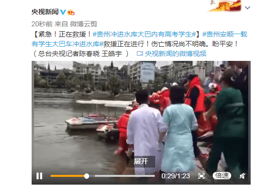 【緊急!正在救援!#貴州沖進(jìn)水庫(kù)大巴內(nèi)有高考學(xué)生#】#貴州安順一載有學(xué)生大巴車(chē)沖進(jìn)水庫(kù)#救援正在進(jìn)行!傷亡情況尚不明確。盼平安!(總臺(tái)央視記者陳春曉 王皓宇 )