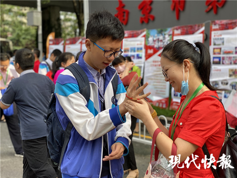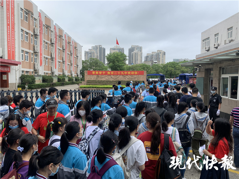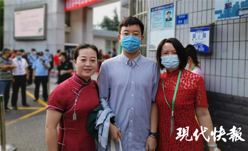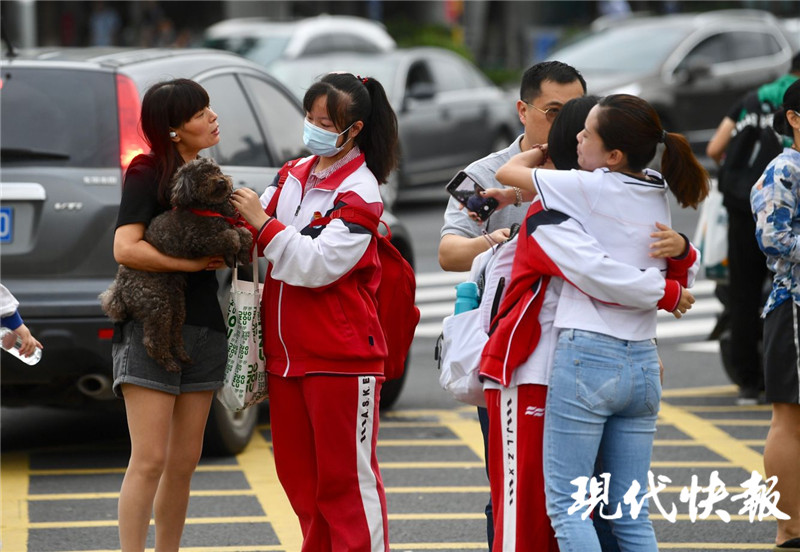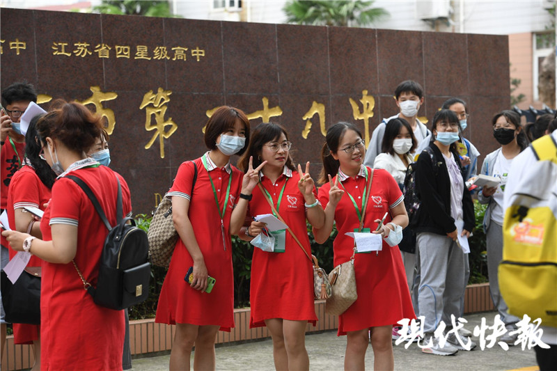 南京市金陵中學(xué)河西分??键c(diǎn)門(mén)口,來(lái)自幾所學(xué)校的考生分批有序進(jìn)場(chǎng)。送考老師和家長(zhǎng)們穿上紅T恤、旗袍,用一個(gè)個(gè)大大的擁抱為學(xué)生們加油!