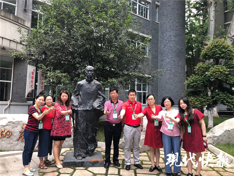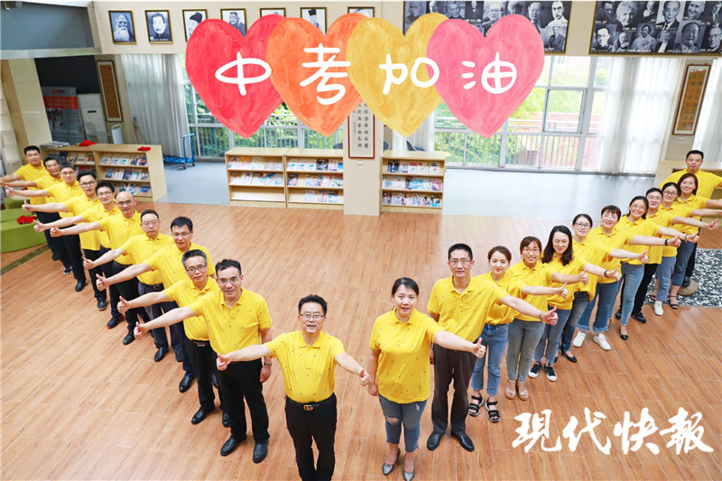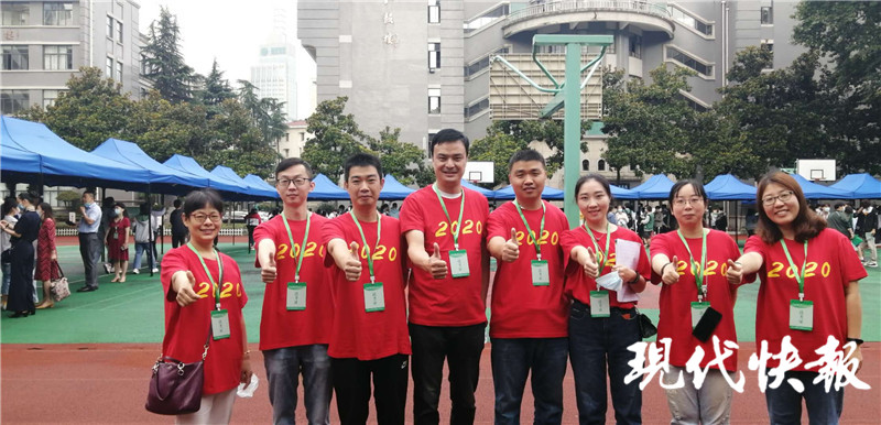 南京大學(xué)附屬中學(xué)中考考點(diǎn)外,來(lái)自南京市第五十中學(xué)和濱江中學(xué)的送考老師早早來(lái)到校門(mén)口為學(xué)生檢錄。濱江中學(xué)送考老師統(tǒng)一穿上了大紅色T恤,胸前寫(xiě)著“2020濱中加油”字樣。等同學(xué)們集結(jié)完畢,幾位穿著紅T恤的老師站在一起,為同學(xué)們加油送祝福:“鎮(zhèn)定自信,正常發(fā)揮,中考必勝,加油吧同學(xué)們!”
