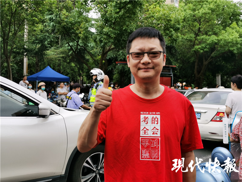 在南京市第二十九中學(xué)考點(diǎn)參加中考的考生,部分來(lái)自鼓樓實(shí)驗(yàn)中學(xué)。一對(duì)父母身穿紅色T恤,胸前寫(xiě)著“考的全會(huì),蒙的全對(duì)”,吸引了不少人注意。“今天早上為了防止堵車,我和孩子?jì)寢屢粋€(gè)人騎電動(dòng)車,一人開(kāi)車來(lái)送考,給孩子準(zhǔn)備雙保險(xiǎn)嘛。”送考的劉先生說(shuō),他們還是比較輕松的,今早為孩子準(zhǔn)備了紅豆糕等早點(diǎn),希望孩子可以在今天的考試中保持好心態(tài),取得好成績(jī)。